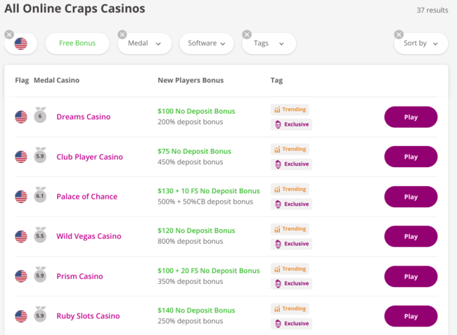 | Bônus grátis | Refine a lista para exibir apenas sites de jogo on -line craps que vêm com um bônus sem depósito. |